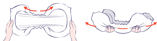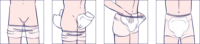 Spread the back part of the shaped adult diaper so that it fits well against the body, and the wetness indicator is aligned with the spine. Pull up the mesh pants at the back. Pull out the front part of the shaped adult diaper, fit it to the crotch. Turn the patient onto their back and, slightly lifting them from the left and right sides, pull up the mesh pants. Roll up the used shaped adult diaper and dispose of it in a waste bin. Do not flush the used product down the toilet.