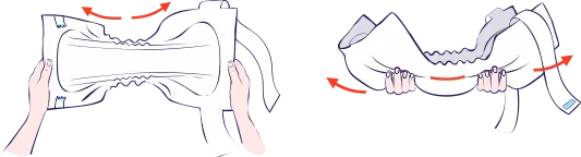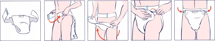 Place the previously activated diaper against the buttocks with the absorbent part, so that the waist belts are at the top. Wrap the belts around the hips, starting from the left side. The belt on the right side has a hook-and-loop fastener, which you can use to adjust the diaper's waist circumference.