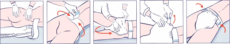 Turn the patient onto their side towards you, and after performing care procedures, place the previously activated product under the patient from behind. Slowly lay the patient onto the diaper. Adjust the waist belts to the patient's hips. Start with the left belt, then adjust the belt on the patient's right side and secure it using the hook-and-loop fastener located at the end of the belt.