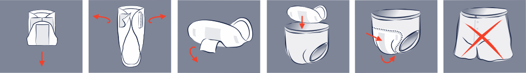 Stick the pad to the underwear in the crotch area slightly towards the front using all adhesive strips, with the wider part facing up.