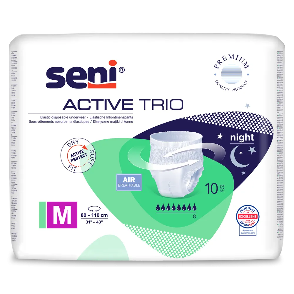 Seni Active Trio breathable disposable underwear for people with very heavy urinary incontinence. Also recommended for use at night.