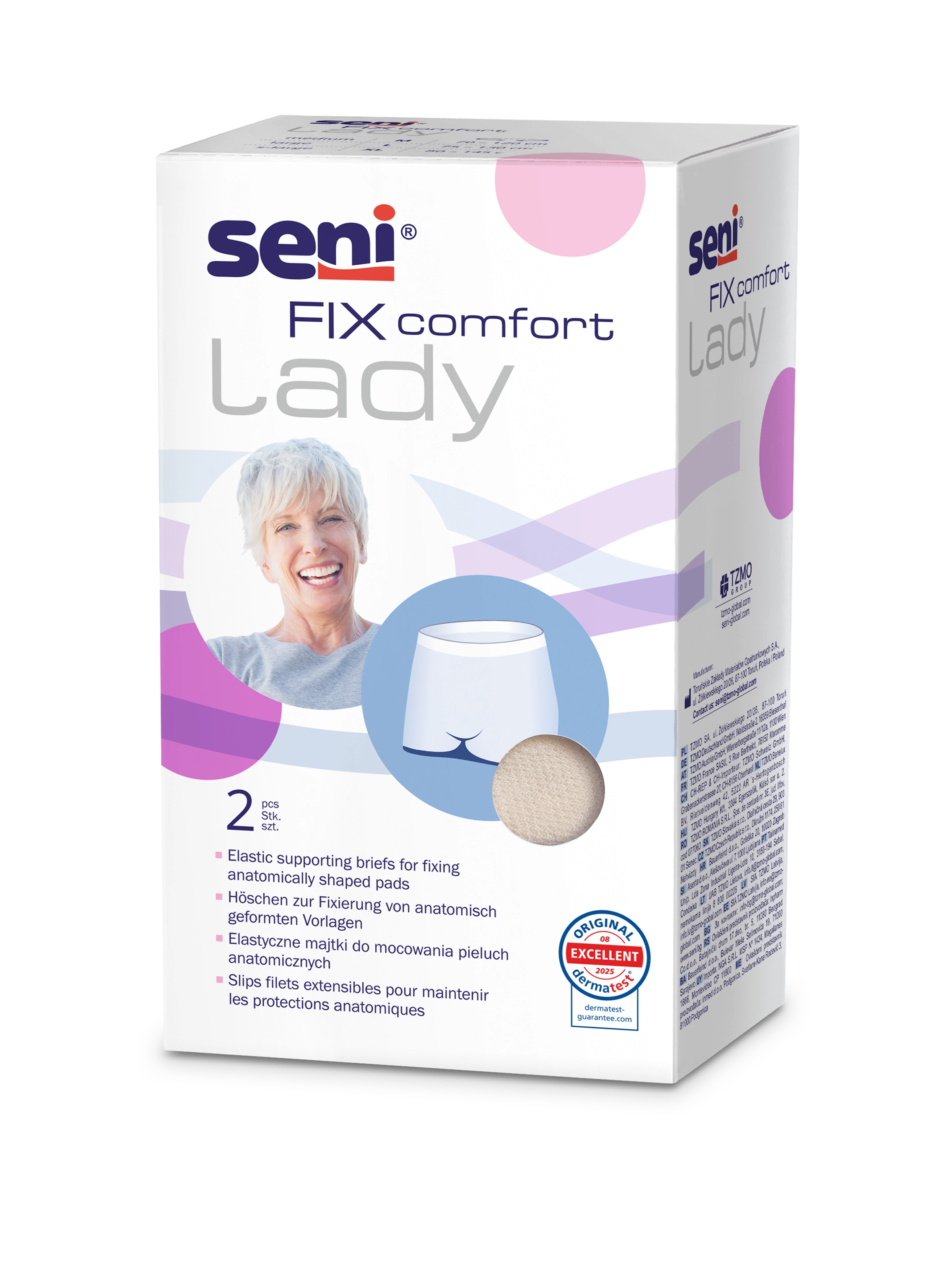 Seni Fix Comfort Lady elastic supporting briefs for fixing Seni San anatomically shaped pads and larger sizes of Seni Lady bladder control pads.