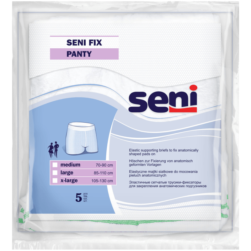Seni Fix Panty elastic supporting longer leg briefs for fixing Seni San anatomically shaped pads and larger sizes of Seni Lady bladder control pads.