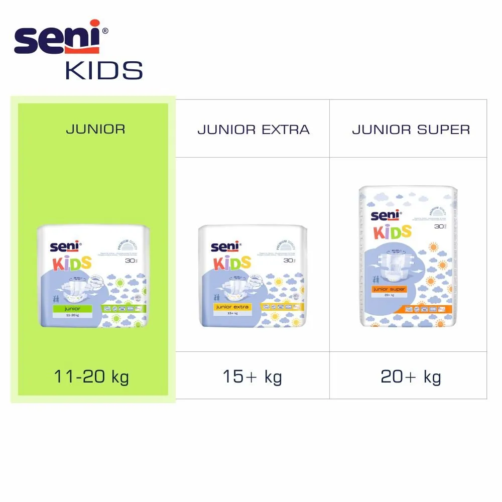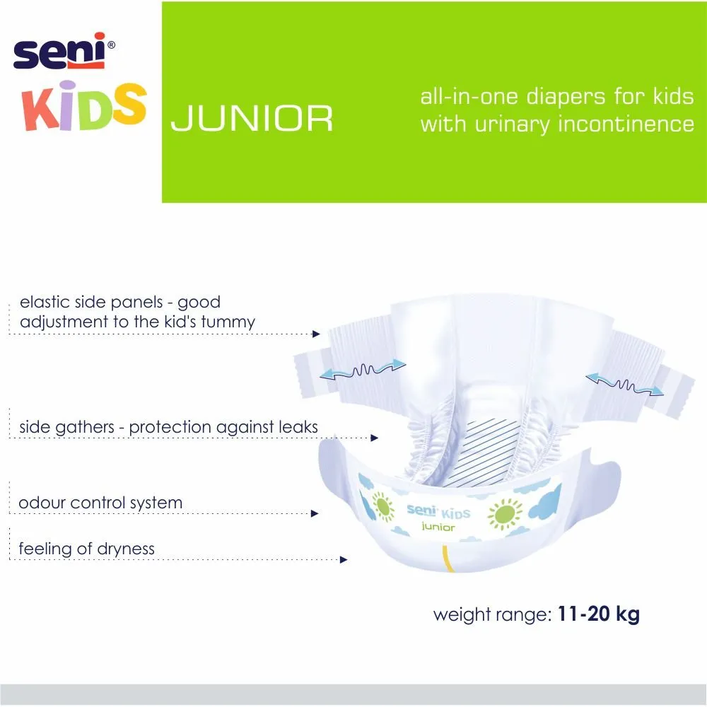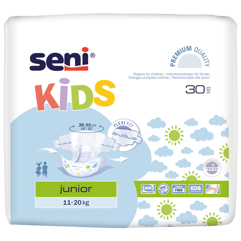 Seni Kids Junior all-in-one diapers for kids with urinary and bowel incontinence for whom baby diapers are too small and still need absorbent, comfortable and effective protection. With standing side gathers and Extra Dry System (EDS) for effective protection against leaks.