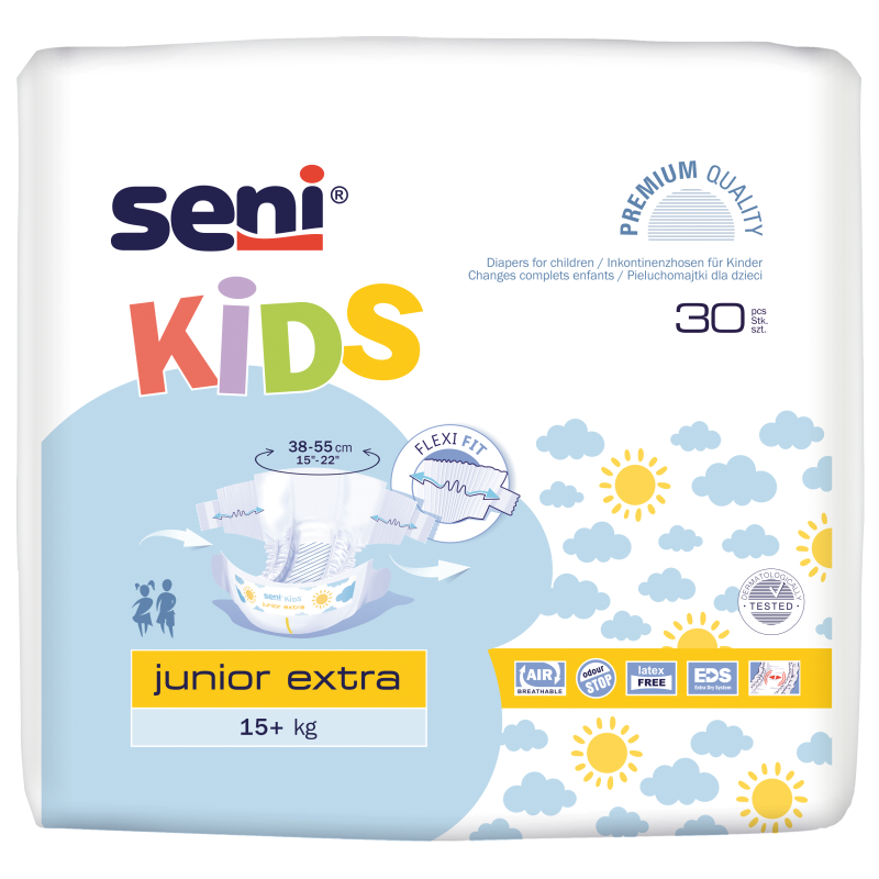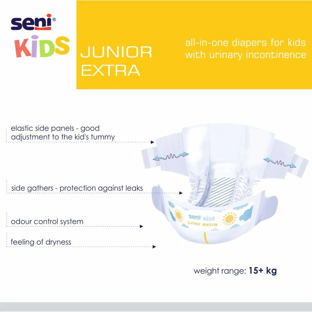 Seni Kids Junior Extra all-in-one diapers for kids with urinary and bowel incontinence for whom baby diapers are too small and still need absorbent, comfortable and effective protection. With standing side gathers and Extra Dry System (EDS) for effective protection against leaks.