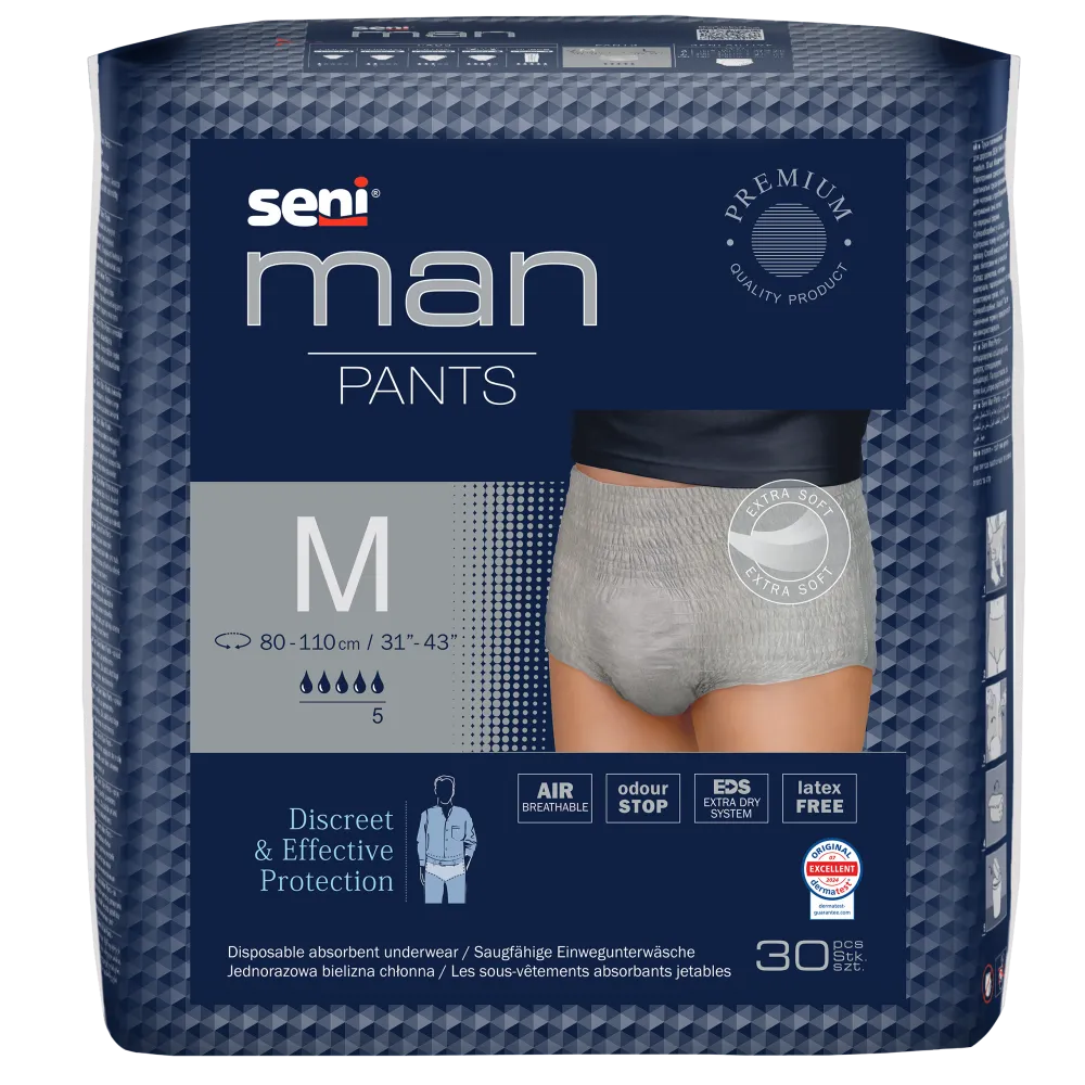 Seni Man Pants is a discreet absorbent underwear for men with light and moderate urinary incontinence, who value freedom of movement and want to feel dry and safe. Seni Man Pants effectively protect against leaks thanks to a wider and extended absorbent core in the front part. With standing side gathers and Extra Dry System (EDS).