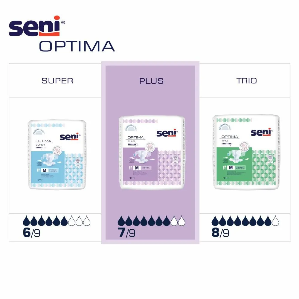 Seni Optima Plus breathable diapers with hip bands for people with heavy urinary incontinence and bowel incontinence.