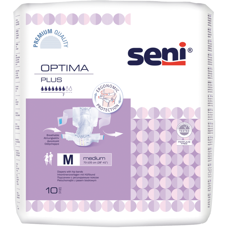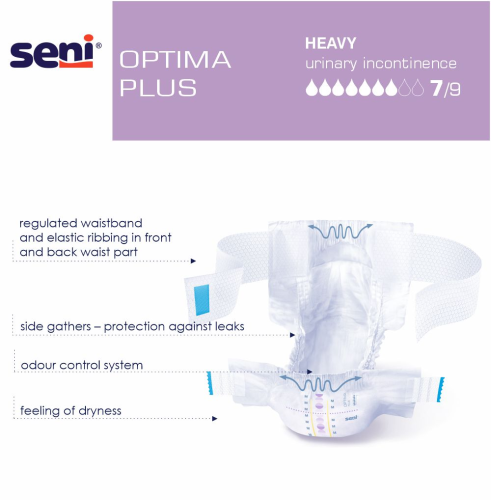 Seni Optima Plus diapers with adjustable hip bands for people with heavy urinary incontinence and bowel incontinence as well. This modern and practical design of the product enables independent use of the toilet. With standing side gathers and Extra Dry System (EDS) for effective protection against leaks.
