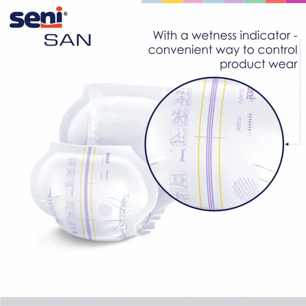 Seni San Maxi breathable anatomically shaped pads for people with moderate and heavy bladder leakage and bowel incontinence.