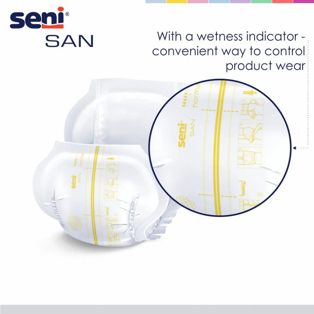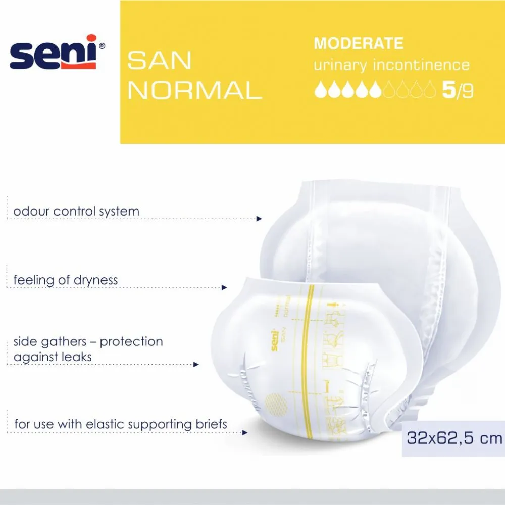 Seni San Normal breathable anatomically shaped pads for people with moderate and heavy bladder leakage and bowel incontinence.