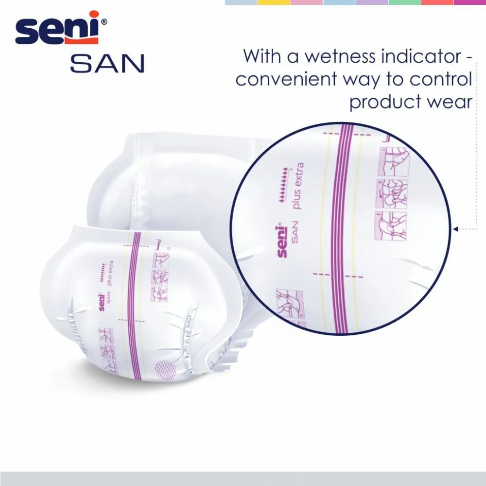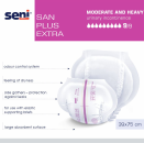 Seni San Plus Extra breathable anatomically shaped pads for people with moderate and heavy bladder leakage and bowel incontinence.