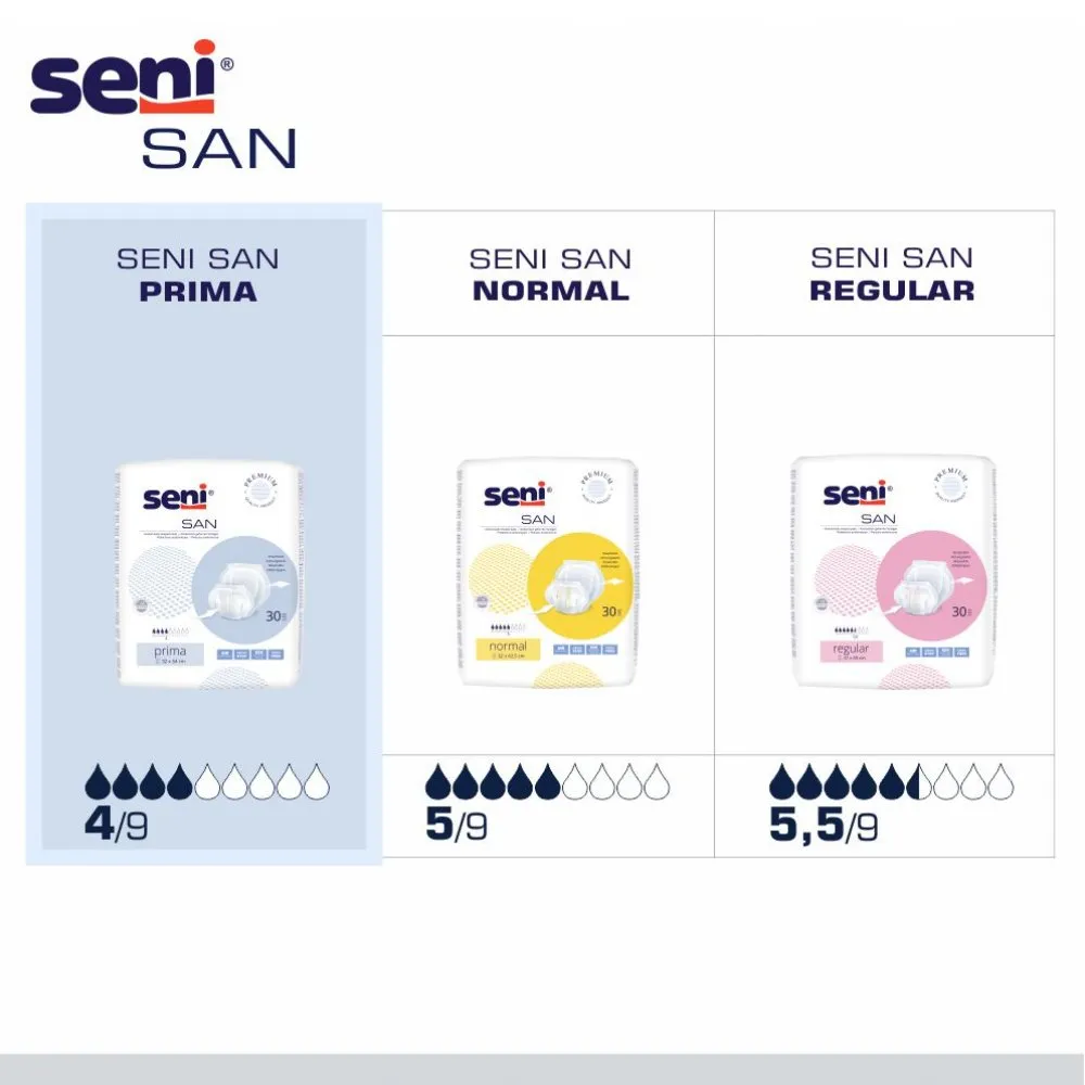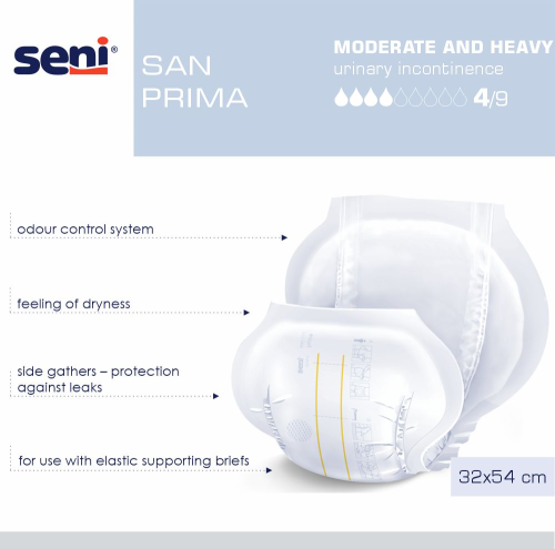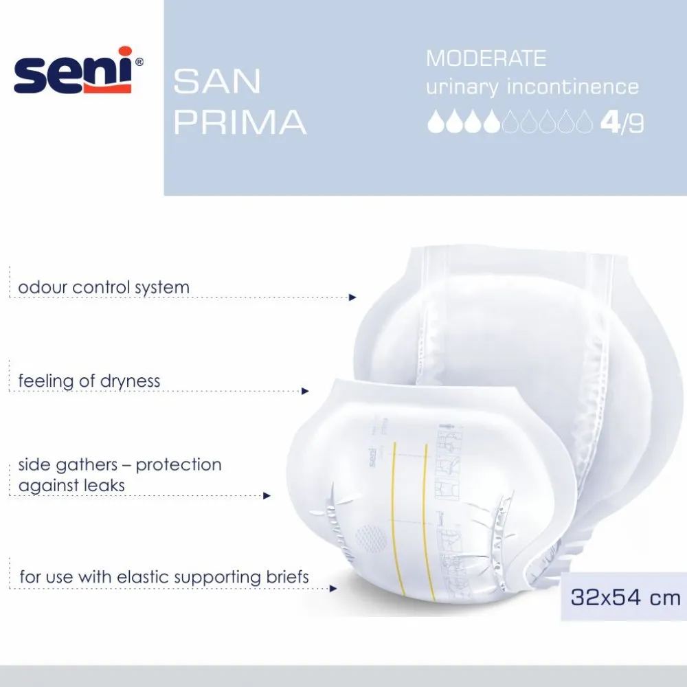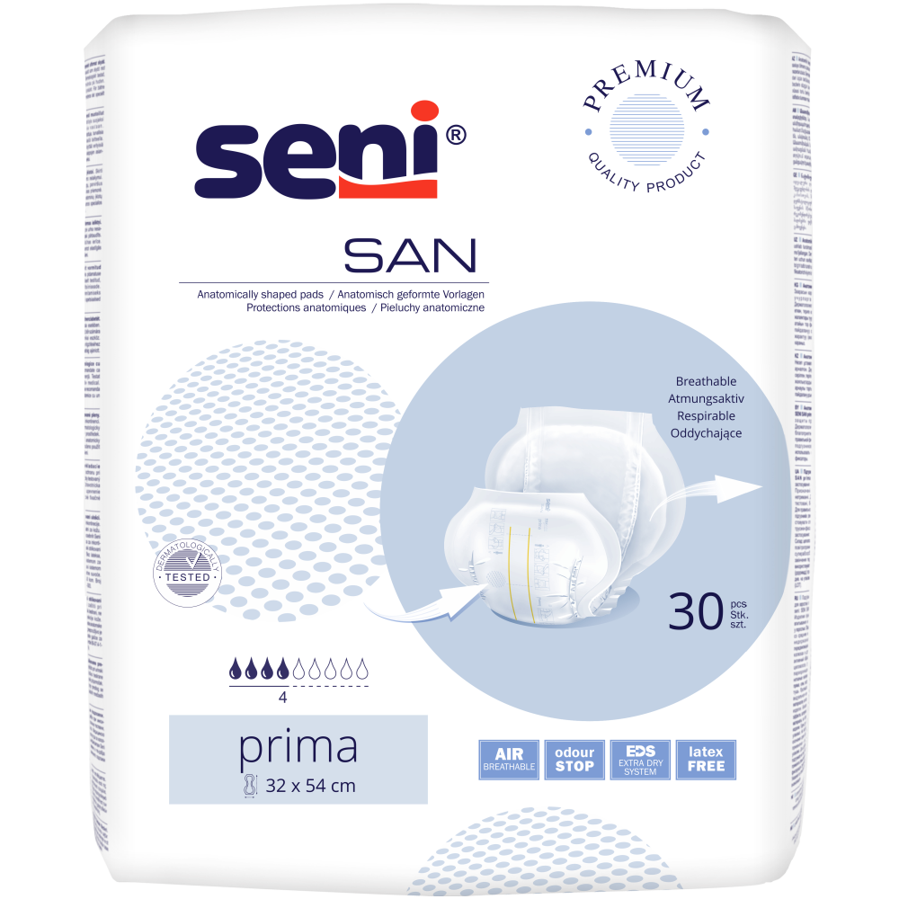 Seni San Prima breathable anatomically shaped pads for people with moderate and heavy bladder leakage and bowel incontinence.