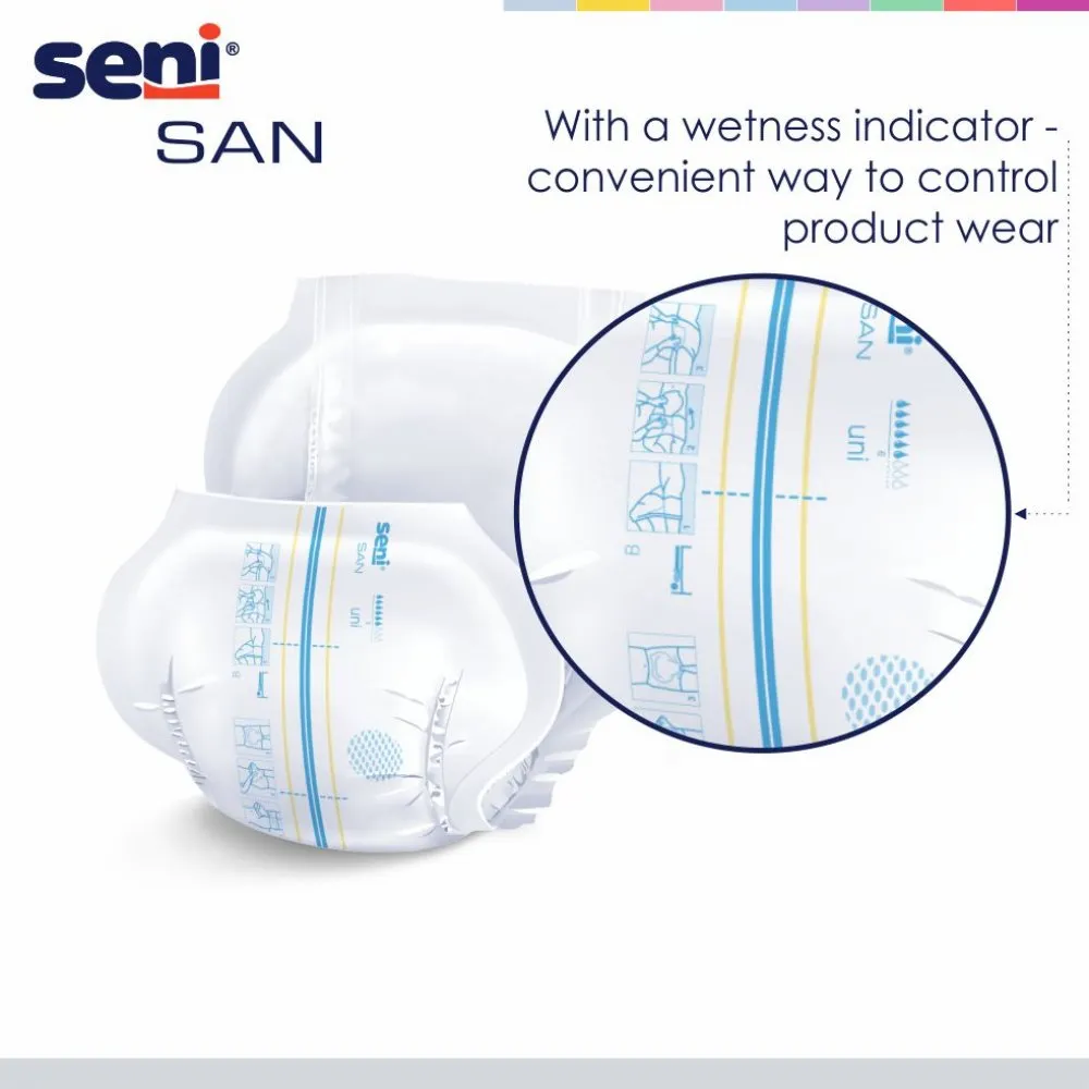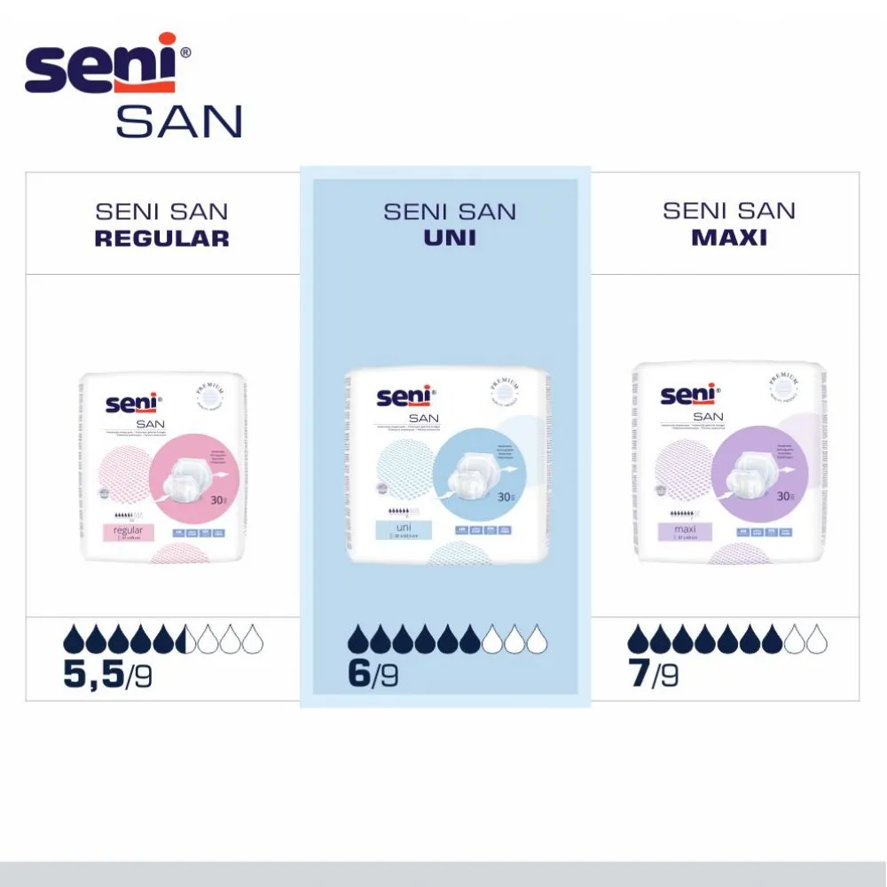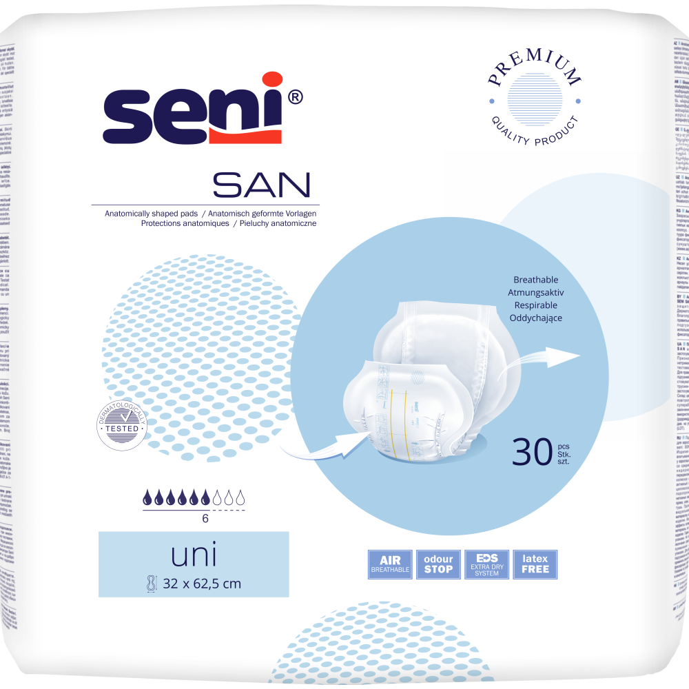 Seni San Uni anatomically shaped pads with an open design are an ideal alternative to traditional adult all-in-one diapers. Suitable for people with moderate and heavy bladder leakage and bowel incontinence. For use with Seni Fix reusable elastic supporting briefs. With standing side gathers and Extra Dry System (EDS) for effective protection against leaks.