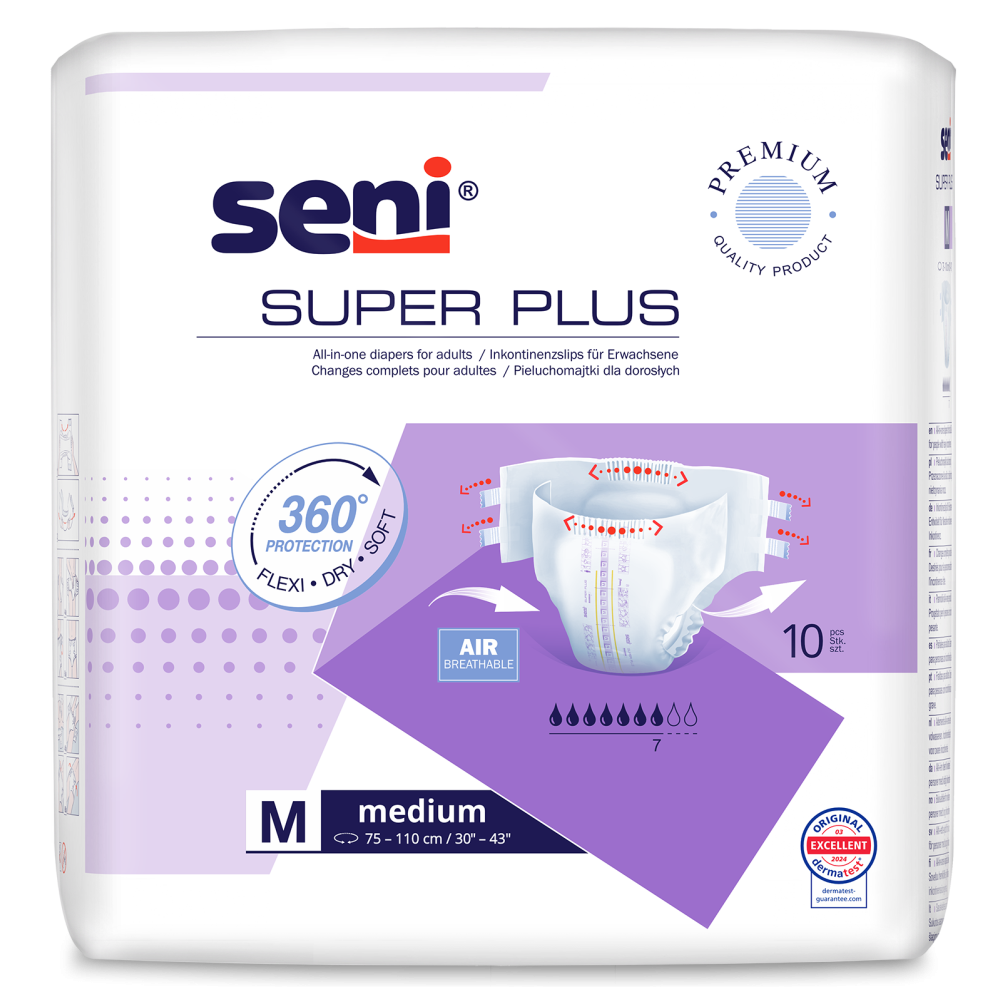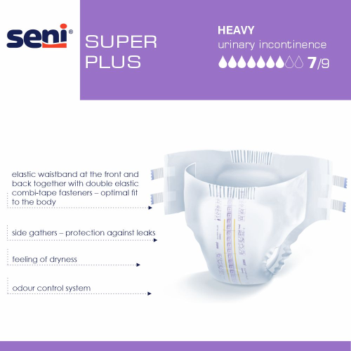 Seni Super Plus all-in-one diapers diapers are traditional and proven protection in heavy urinary incontinence and bowel incontinence as well. They fit perfectly to the body thanks to the elastic waistband at the front and back of the product and 4 elastic combi-tape fasteners for multiple attachment. With standing side gathers and Extra Dry System (EDS) for effective protection against leaks.