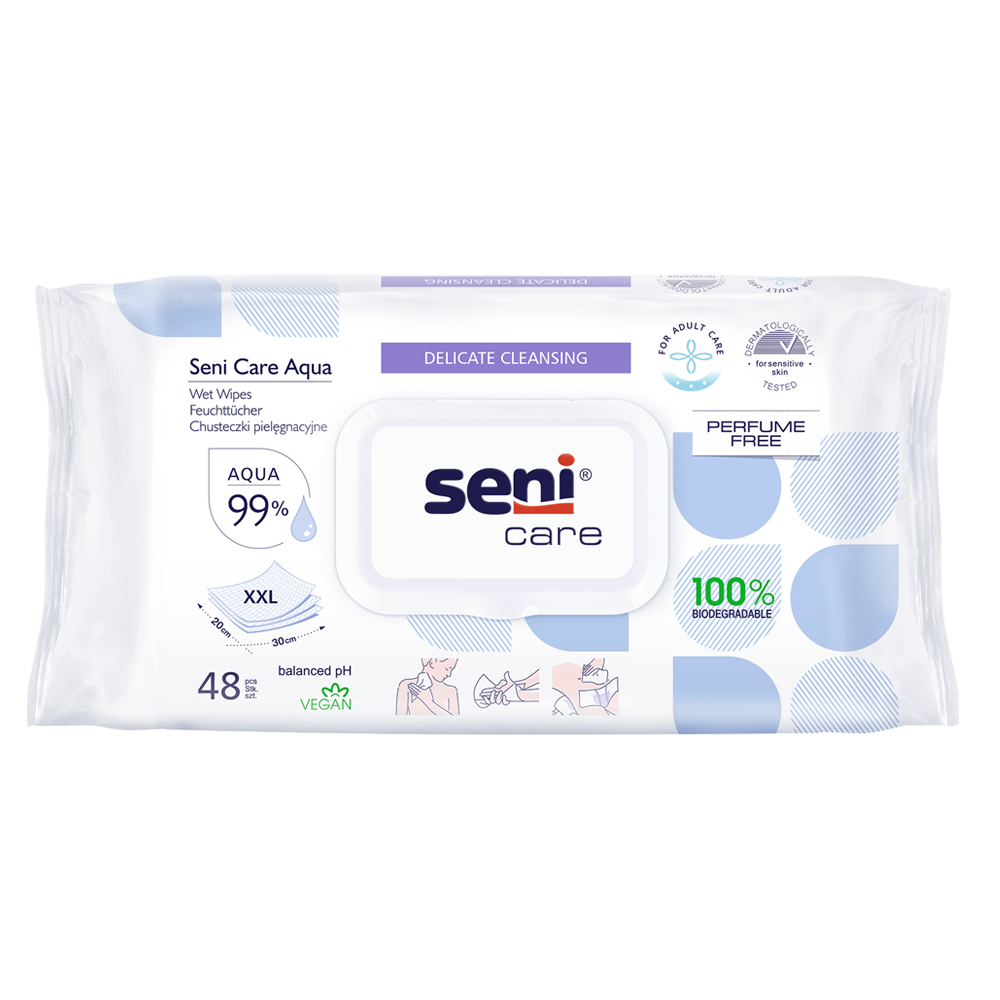 Seni Care care wipes, moistened with 99% water, make it easy to maintain hygiene throughout the day, especially for people with urinary incontinence.